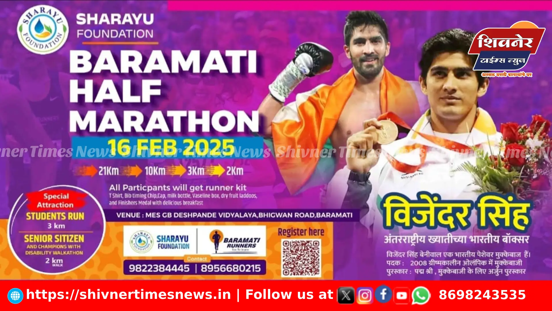 बारामती: शरयू फाउंडेशन आणि बारामती रनर्स यांच्या संयुक्त विद्यमाने यंदा बारामती हाफ मॅरेथॉनचे तिसरे वर्ष सुरू होत आहे. येत्या रविवारी, १६ फेब्रुवारी २०२५ रोजी बारामतीत होणाऱ्या या हाफ मॅरेथॉनमध्ये 5000 पेक्षा अधिक स्पर्धक सहभागी होणार आहेत. मुष्टियोध्दा आणि ऑलिंपिक पदक विजेते बॉक्सर विजयेंदरसिंह यावेळी उपस्थित राहून या स्पर्धेला अधिक रंगत आणणार आहेत.