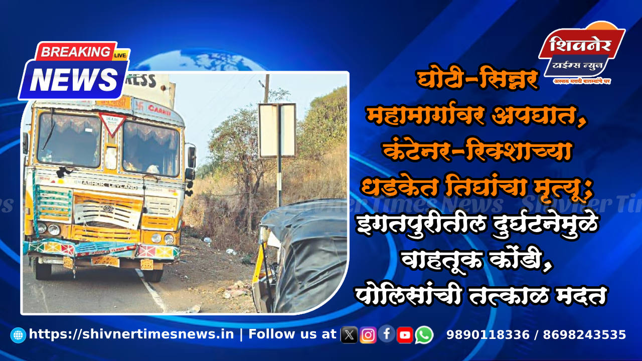 घोटी-सिन्नर महामार्गावर अपघात, कंटेनर-रिक्शाच्या धडकेत तिघांचा मृत्यू; इगतपुरीतील दुर्घटनेमुळे वाहतूक कोंडी, पोलिसांची तत्काळ मदत
