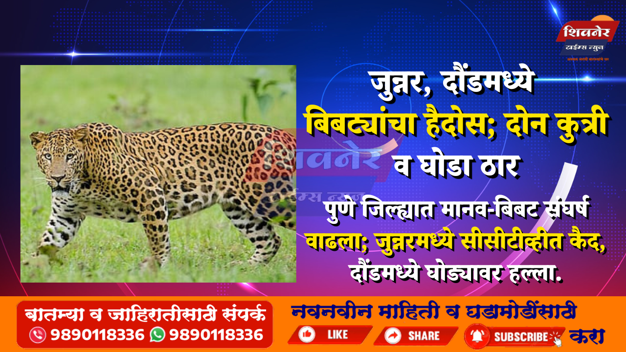 आपटाळे/खुटबाव: पुणे जिल्ह्यातील जुन्नर आणि दौंड तालुक्यांमध्ये बिबट्याच्या वाढत्या वावरामुळे प्रचंड भीतीचे वातावरण निर्माण झाले आहे. या दोन्ही तालुक्यांत बिबट्याने पाळीव प्राण्यांवर हल्ले केल्याच्या दोन गंभीर घटना समोर आल्या आहेत. जुन्नरमधील वैष्णवधाम, गवारवाडी वस्तीमध्ये बिबट्याने एका घरातील दोन पाळीव कुत्र्यांचा फडशा पाडला, तर दौंडमधील पारगाव येथे मेंढपाळाच्या ५० हजार रुपये किमतीच्या घोड्याला ठार केले.