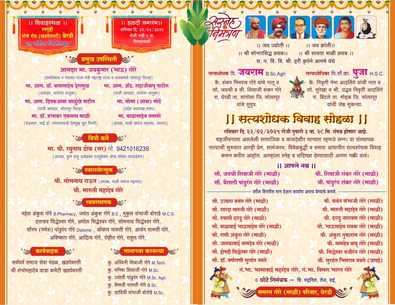 सांगोला: फुले शाहू आंबेडकर एज्युकेशनल अँड सोशल फाऊंडेशन पुणे चे बहुउद्देशीय सत्यशोधक केंद्रातर्फे आणि सोमनाथ राऊत, कार्याध्यक्ष महाराष्ट्र माळी समाज महासंघ यांचे प्रयत्नामुळे रविवार दि.23 फेब्रुवारी 2025 रोजी दु.3.30 वाजता सांगोला ,घेरडी (स्वगृही) येथे जेष्ठ समाजसेवक व प्रगतशील शेतकरी शिवाजीराव गोरे यांचा सत्यशोधक जयराम गोरे,B.SC.Agri आणि समाजसेवक उद्दव आदलिंगे यांची सत्यशोधिका पुजा आदलिंगे, HSC यांचा महात्मा फुले यांना अभिप्रेत असलेल्या पद्धतीने सत्यशोधक विवाह सोहळा संपन्न होणार आहे.