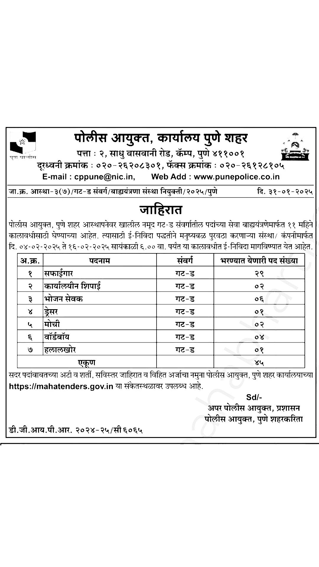 पुणे पोलिस आयुक्तालयाने गट-ड संवर्गातील विविध पदांसाठी कंत्राटी भरती प्रक्रिया सुरू केली आहे. या भरती प्रक्रियेद्वारे सफाई कामगार, शिपाई, वॉर्डबॉय, मोची, ड्रेसर, हलालखोर इत्यादी एकूण ४५ पदांवर नियुक्ती केली जाणार आहे. या पदांसाठी निवड झालेल्या कर्मचार्यांना ११ महिन्यांच्या कालावधीसाठी नियुक्ती देण्यात येईल.
